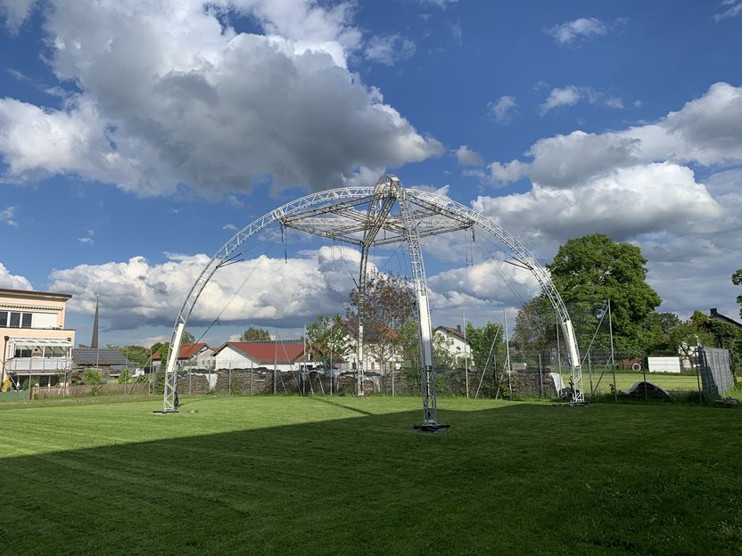 Sie ragt 10 Meter in die Höhe, hat eine Grundfläche von 12 x 12 Metern und trägt dank ihrer gewölbten Form den Namen "GLOBE" - eine spektakuläre und einzigartige Trainingsfläche für Luftakrobatik hat die Firma Teatime Concerts aus München mit Prolyte Traversen realisiert. Endkunde ist die Artistikgruppe Movimento des "TSV Grafing. Sie suchte eine nach einer Möglichkeit, in Coronazeiten ihren Trainings- und Showbetrieb wieder aufnehmen zu können - und zwar outdoor.