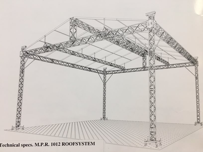 The MPR roof system is nowadays known as the MPT system. The standard MPR system was available in a 10x10, 10x12, 12x10,and 12x12 meter configuration. The tower is (still) built from an H30V truss, along with the main grids H40V and with H40D roof support trusses. The gable and rafters of the roof were produced of rectangular extendable profiles that enabled you to change the size of the rooftop quite easily.