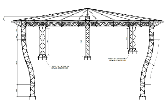 It was a 12-meter diameter roof built out of H40V trusses, standing on 6 curved legs. A specially designed centrepiece that connects all the main grid trusses together with the …… on top holds the canopy.