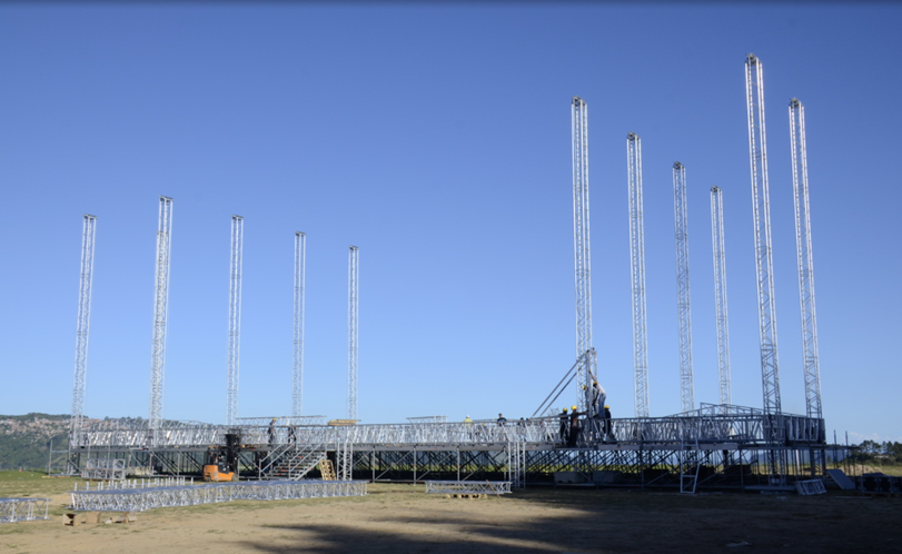 The XXL Roof is based on Prolyte CT Towers comprising of C52T mast sections, a B100 Series ground support system, and B52SV truss rafters. The CT Tower uses several sleeve blocks that combine the trusses from the Prolyte S and B Series. The CT sleeve block is a fully bolted structural element, making it much stronger and more precise than conventional welded versions. The roof is fully integrated with a Layher staging system and offers a loading capacity of 40,000kg UDL (uniformly distributed load) with an additional sound wing capacity of 6000kg per side. The finished structure measures a maximum of 25m x 20m with 16m clearance, the highest point being at 20m.