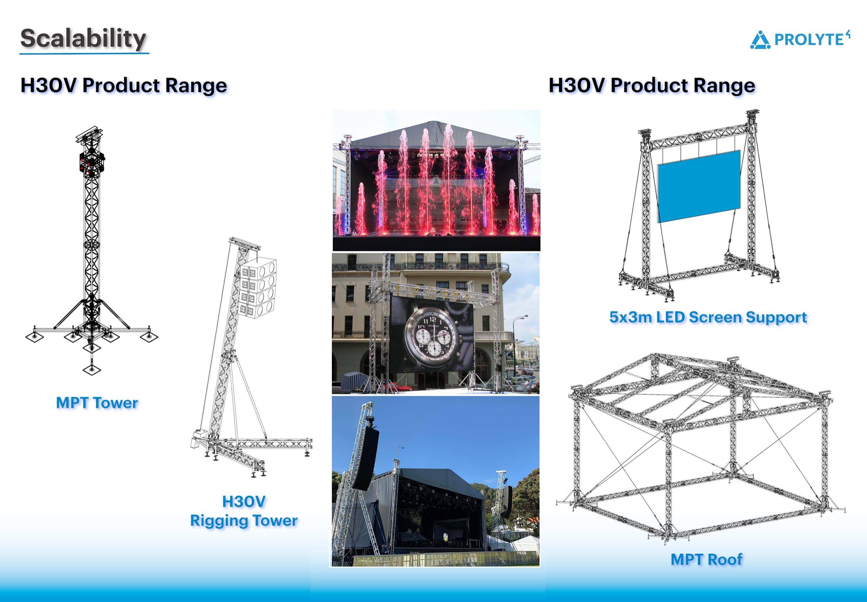 “With the investments we had already made in H30V and H40V trusses, the MPT was a clear choice. Prolyte’s design approach of using standard trusses, combined with some special components for roof systems, eased the financial burden as we didn’t have to purchase the entire system at once. This ensured our ability to increase profit by having more useable trussing in the off-seasons.” – Jeff Hewitt, Managing Director for