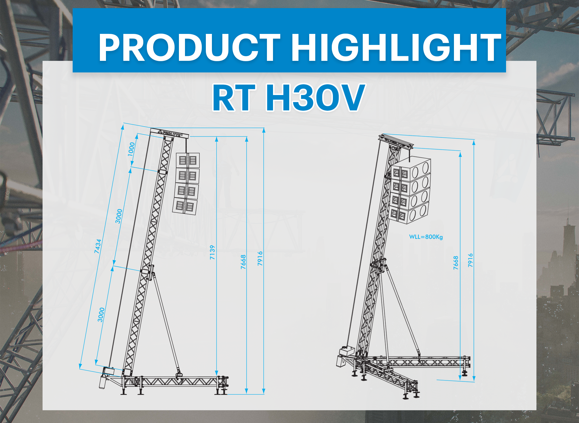 The RT H30V, with a loading capacity of 800 kg and a maximum lifting height of 7,60 meters is the product highlight of the month. The RT H30V is based on H30V truss with stabilisers of 60 mm tube. It has a self-weight of 260 kg. The legs of the V-shaped base can be levelled by means of screw jacks, which are attached to the side of the legs.