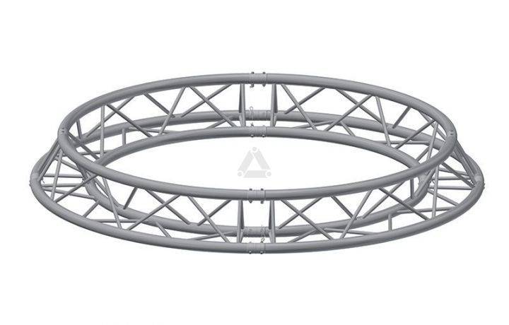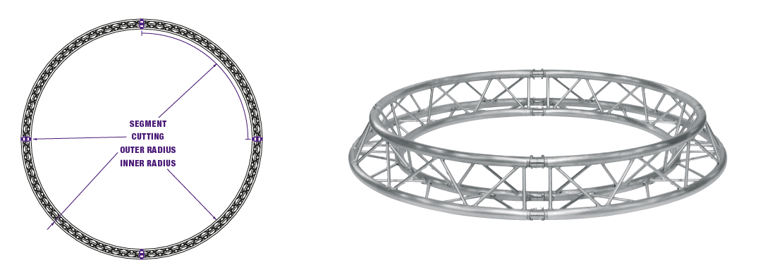 Circular or curved trusses are manufactured in different diameters or degrees. When ordering a complete circular truss, the number of cuttings required (each segment requires one cut) must be indicated. Couplers do not have to be ordered separately, as they are included in the amount of cuttings ordered. A “cutting” divides the circle into segments. Individual segments cannot be longer than 5 metres. ProlyteStructures recommends segment lengths of between 3/4 metres, and an even number of segments. For further details in this regard, please refer to the