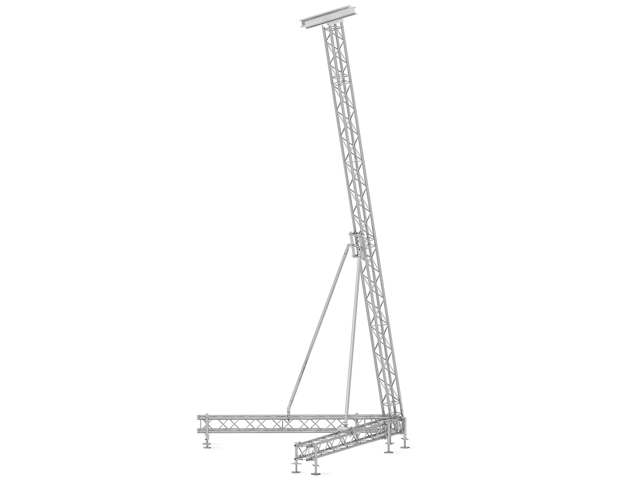 The light-duty RT H30V has a loading capacity of 800 kg and a maximum lifting height of 7,60 m. The RT H30V is based on H30V truss with the stabilisers of 60 mm tube. It has a self-weight of 260 kg. The legs of the V-shaped base can be levelled by means of screw jacks, which are attached to the side of the legs. After the base is placed, the mast can be build and erected using the hinges on the base corner. The mast should be stabilised by means of the braces, which fix to the legs. After the system is levelled and ballast is applied, the load can be hoisted in position. Its relatively small dimensions make it suitable for a range of applications, including outdoor events, concerts, shopping malls, halls, exhibition areas and theme parks.