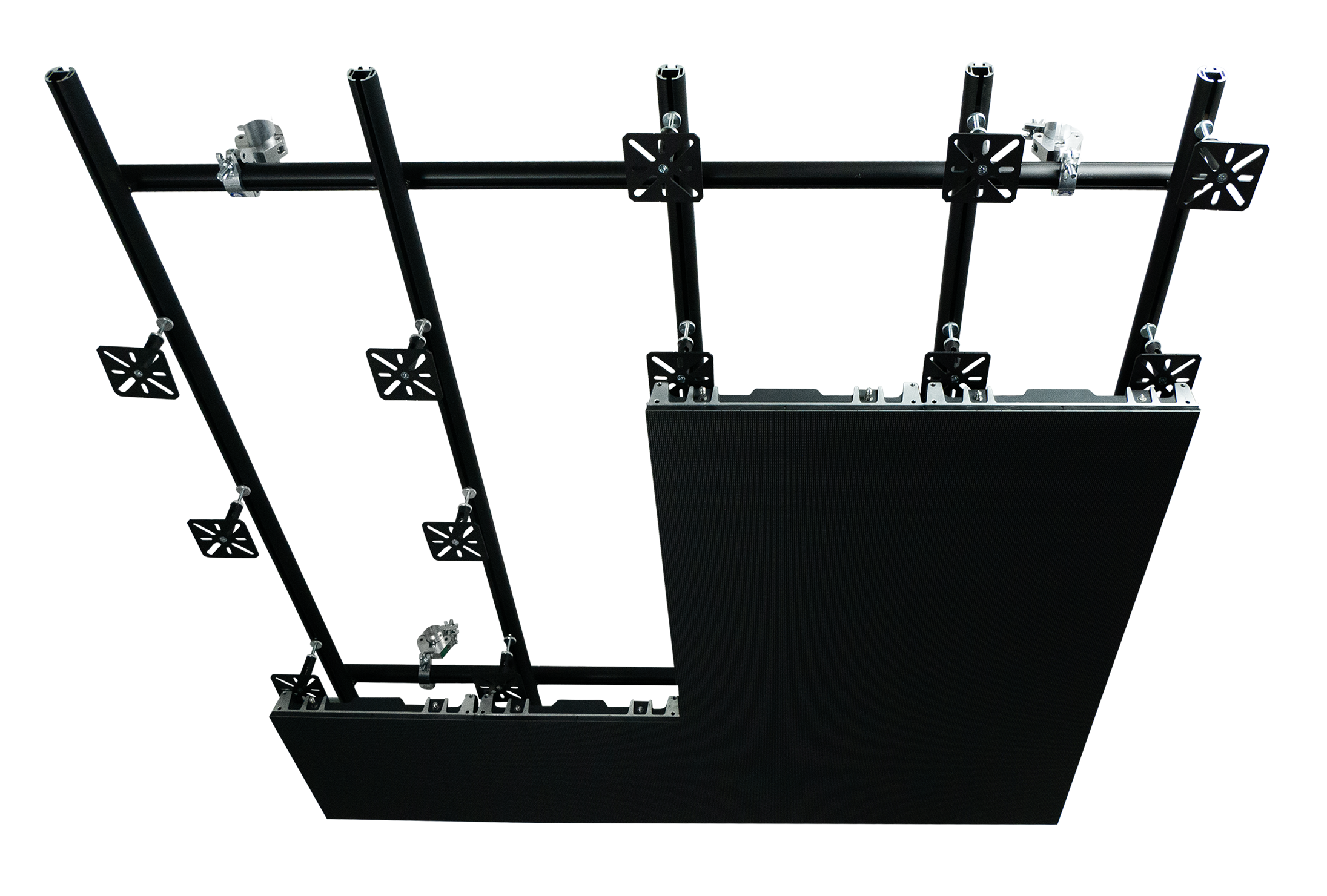 The LED panel adapters are available in a fixed version as well as an adjustable version. The adjustable version can be modified in height by 3 cm, which enables you to correct possible deflection of the truss span/grid or tube. The design of the adapter allows you to keep easy access to the backside of the panels for mouting the cabling of the system or for maintenance.
