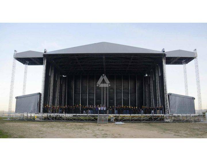 The XXL roof system is based on 13 CT towers, of which one is a stack tower underneath the back span. The roof has main grid based on B100RV truss and a pitched roof structure based on B52SV truss, which is the standard S52SV truss adapted with a main chord of 60 x 6 mm. Layher adapters guarantee a flawless integration of the towers and the stage. ProLyft Aetos hoists lift the 17-ton structure in place. The main roof area can be constructed in 3 different sizes 30m. x 20m, 25m. x 20m, 20m x 20m, realising a clearance of 14m. between the stage and the main grid. The loading capacity of the roof is approx. 30 ton, uniformly distributed along the roof.