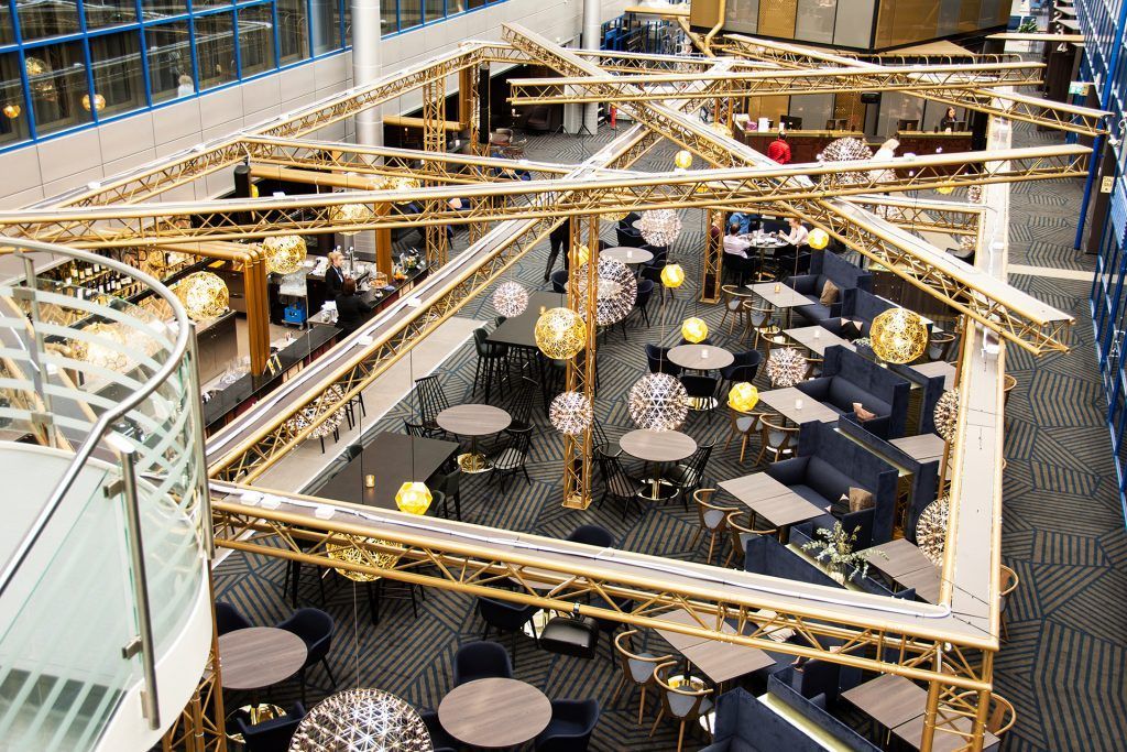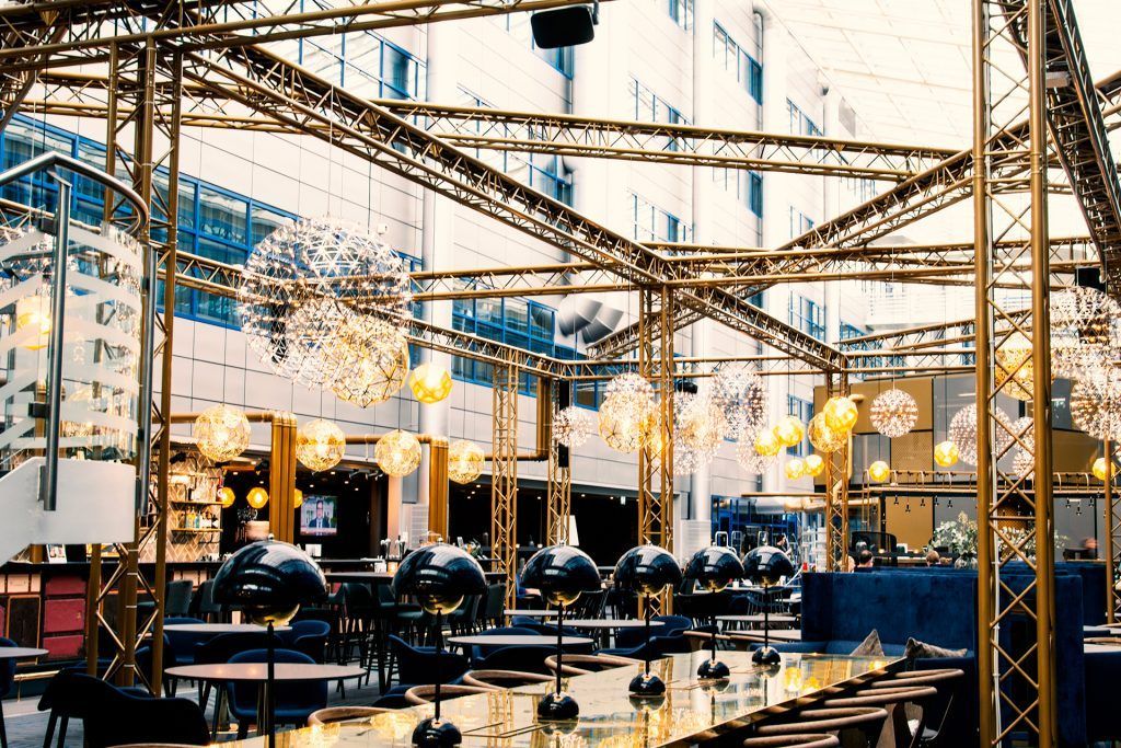 Beautiful and spectacular structures can be created everywhere. A gold-coloured Prolyte truss structure was used for the main lobby of Scandic Airport (at Helsinki-Vantaa Airport), marking the area reserved for the Breakfast- and a la Carte- restaurants.